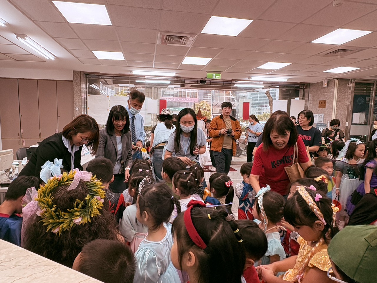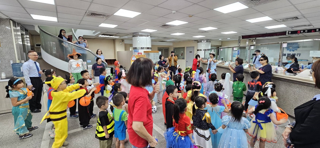 活動當天,幼兒園的小朋友在老師與家長的陪同下,化身為各式各樣的萬聖節角色,穿梭於社區街道間,逐一拜訪合作店家,開心地以「不給糖就搗蛋」的方式進行互動表演。本行全體同仁特別準備精美包裝的糖果與餅乾,親手分送給每位小朋友,現場笑聲不斷,氣氛熱烈。