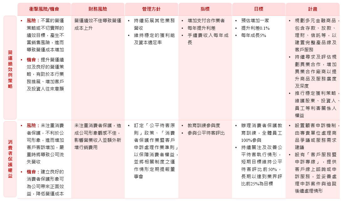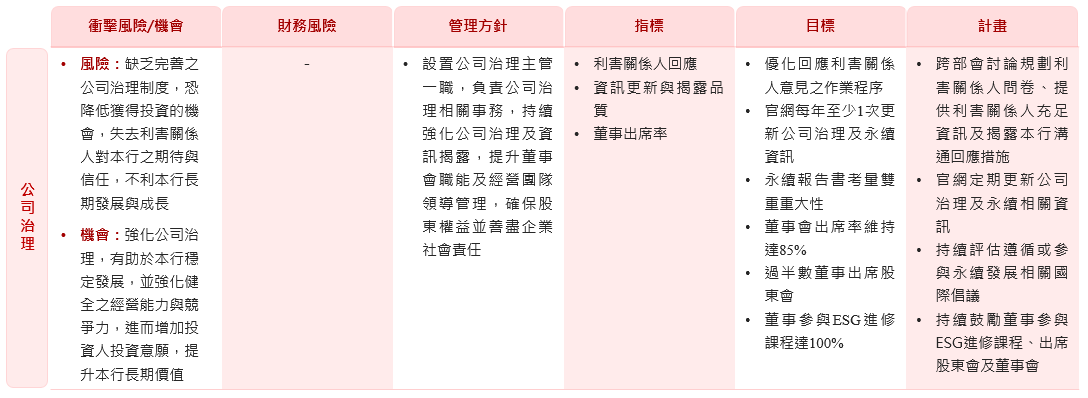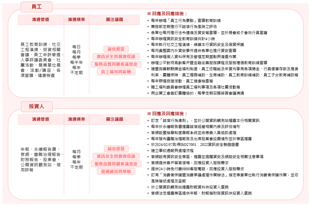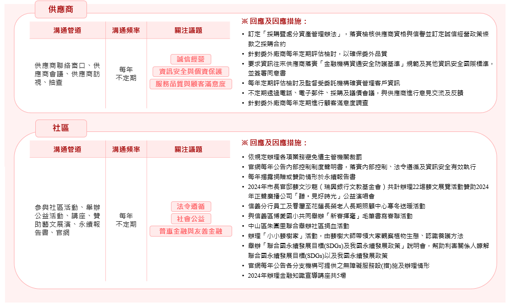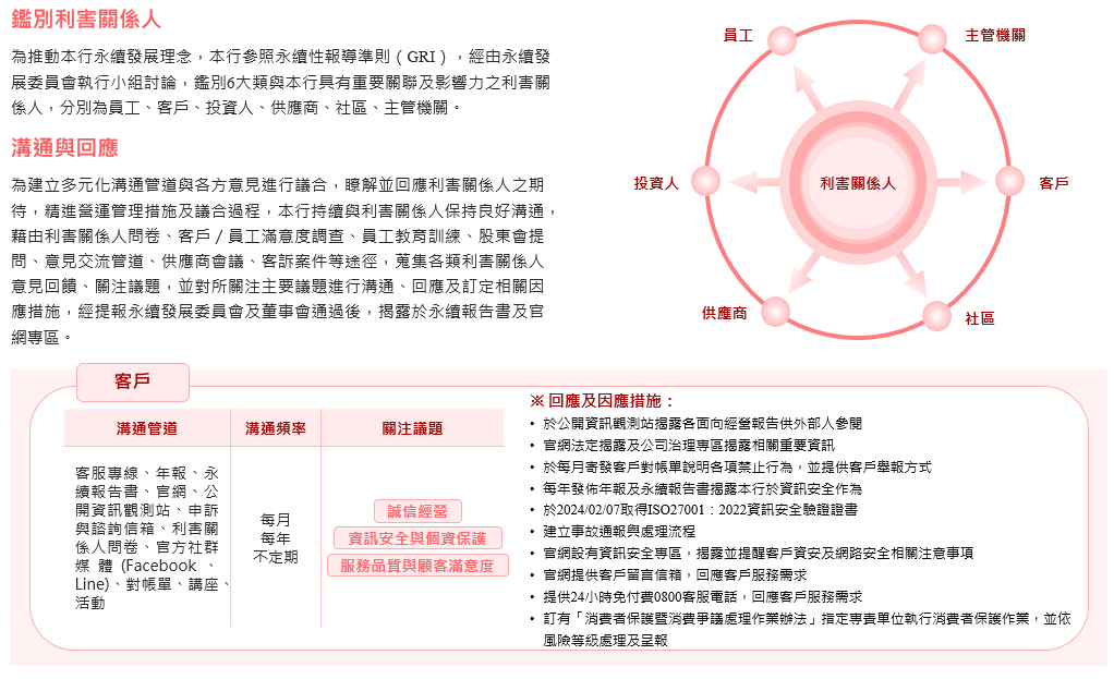 為落實永續發展推動,本行於董事會下設立「永續發展委員會」,由董事長擔任召集人、全體獨立董事及總經理擔任委員,下轄「永續發展執行小組」,以總經理為召集人,至少每季召開一次會議,組員為總行各部室單位主管,另於「永續發展執行小組」下設立五個工作分組,分別為:客戶權益及社會共融小組、人權人力及員工關懷小組、公司治理小組、永續金融小組及永續環境小組,以利進行後續金融評鑑及相關工作追蹤,並由業務部彙整各項ESG議題執行成效,於永續報告書中揭露相關資訊,定期向董事會報告年度永續發展執行成效。 經本行「永續發展執行小組」共同討論及鑑別出與各單位業務職掌相關且密切接觸之利害關係人(此與金控法/銀行法所指之利害關係人不同),並參考同業分類及執行小組討論後,鑑別出主要的利害關係人,分別為員工、投資人、主管機關、客戶、供應商及社區等六大群組。另為掌握各方利害關係人群組關注的各項重大主題及需求,針對各方利害關係人群組均設有專屬溝通管道,相關溝通管道與回應方式分別說明如下: