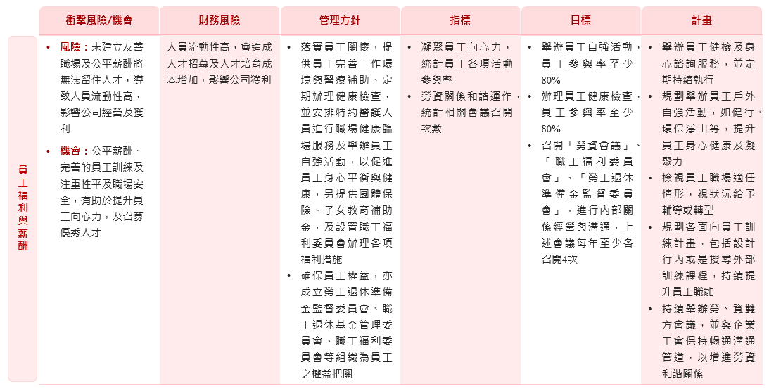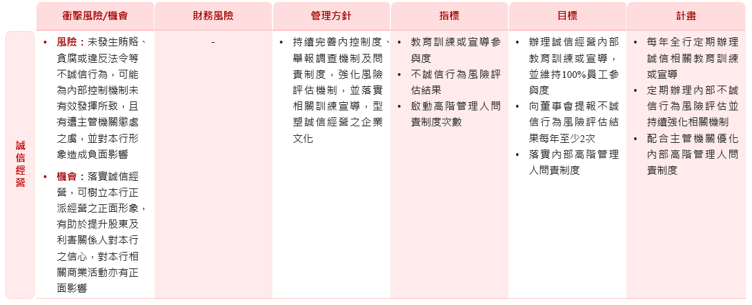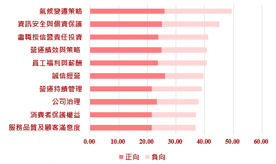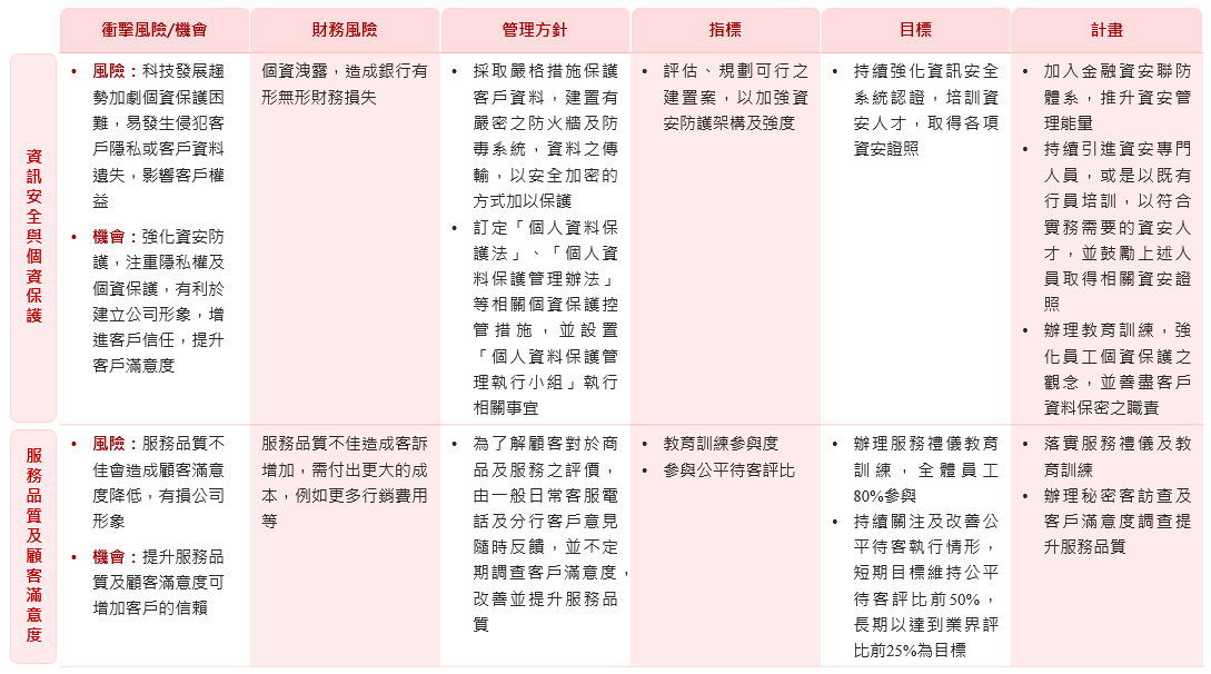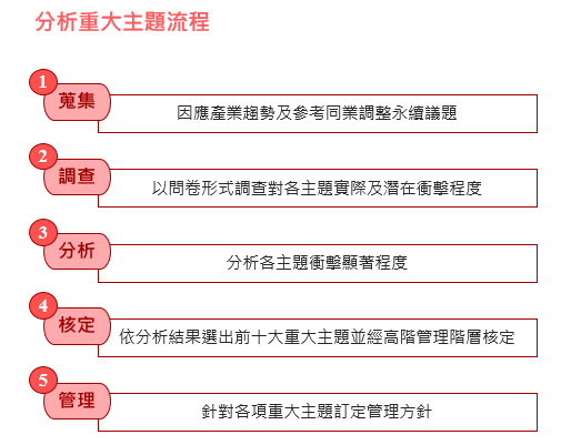 重大主題之鑑別 本行2024年重大主題之鑑別程序沿用2023年作法及結果,以問卷形式調查本行內部就20項永續議題對經濟、環境、人群及人權面向產生的影響,並依實際/潛在、正向/負向的影響程度及發生機率各分為1~5分進行綜合評估後,再依據調查評估結果,就各項議題之衝擊程度進行排序,將前十大具顯著衝擊之永續議題列為本行關注之重大主題,提報高階管理階層核定。 2024年本行鑑別之重大主題分別為:「氣候變遷策略」、「資訊安全與個資保護」、「盡職授信暨責任投資」、「營運績效與策略」、「員工福利與薪酬」、「誠信經營」、「營運持續管理」、「公司治理」、「消費者保護權益」與「服務品質與顧客滿意度」。