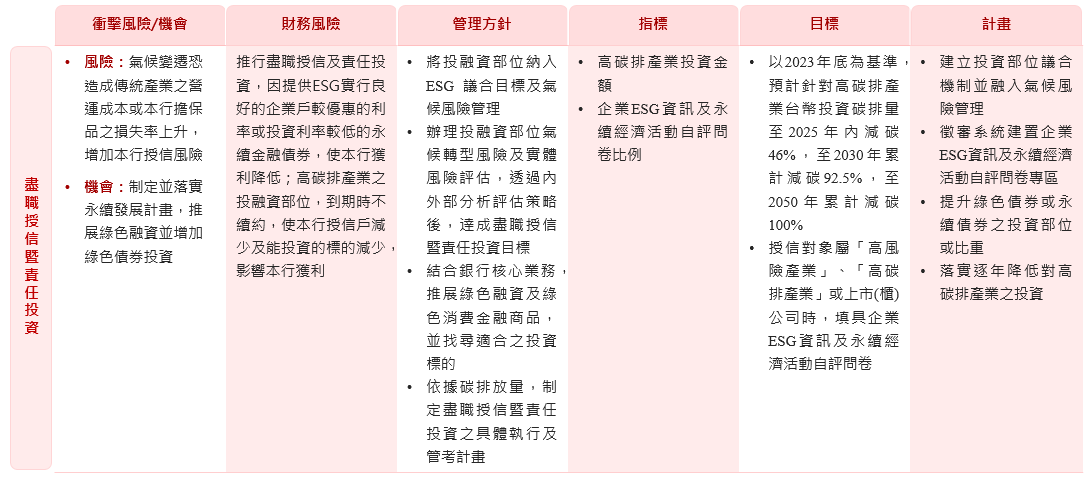 永續議題管理程序 為落實永續發展推動,本行於董事會下設立「永續發展委員會」,由董事長擔任召集人、全體獨立董事及總經理擔任委員,下轄「永續發展執行小組」,以總經理為召集人,至少每季召開一次會議,組員為總行各部室單位主管,另於「永續發展執行小組」下設立五個工作分組,分別為客戶權益及社會共融小組、人權人力及員工關懷小組、公司治理小組、永續金融小組及永續環境小組,負責推動永續發展相關事宜,並由業務部彙整各項議題執行成效,定期向委員會及董事會報告,並於永續報告書中揭露相關資訊。