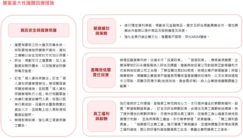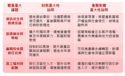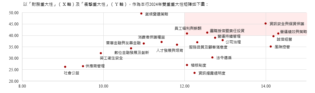 雙重重大性議題 雙重重大議題評估分析 為回應國際ESG發展趨勢及利害關係人關注,本行依據雙重重大性(Double Materiality)原則,藉由評估20項永續議題之「衝擊重大性」及「財務重大性」,篩選2024年項具高度財務及衝擊影響之雙重重大議題,分別為「資訊安全與個資保護」、「營運績效與策略」、「盡職授信暨責任投資」及「員工福利與薪酬」,並就相關具體評估結果擬定因應措施,提報永續發展委員會及董事會通過。